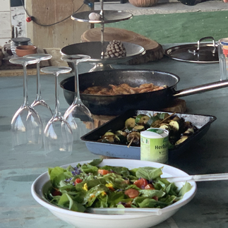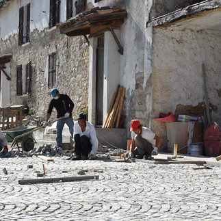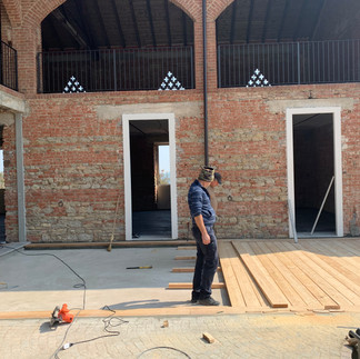 Gemeinschafts- und Workshopraum. Die Gemeinschaftsküche mit Essraum und Lounge wird ein Bijoux. Barbara als Bauleiterin und Cristina, unsere Architektin und Freundin, sind an allen Ecken und Enden gefordert. Mal ist die Invasion der chinesischen (!) Pflästerer zu koordinieren, mal ein Detail in der Gemeinschaftsküche zu justieren oder die Bodenplatten auszuwählen. Und es gilt handfest anzupacken: Die massiven Bretter des Holzrost für den Vorplatz der Aussenbestuhlung müssen aus dem Weg zu geräumt, die alten Eisenfenster grundiert und angemalt oder die Holzstiegen für den Treppenaufgang zum Workshopraum geölt werden.